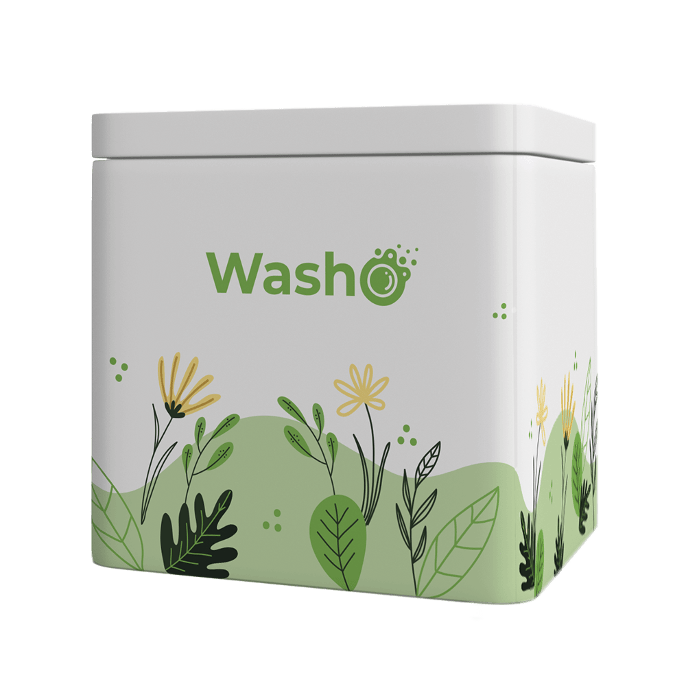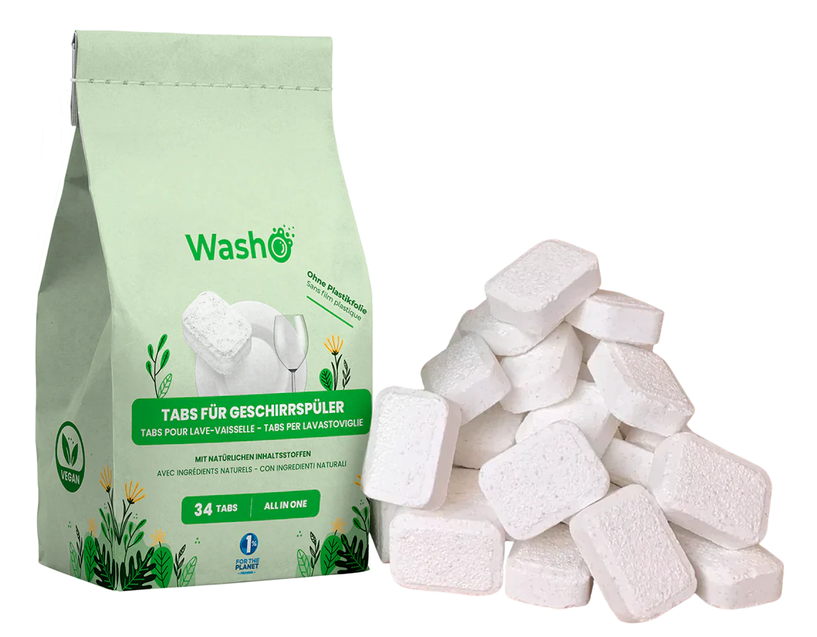 Washo Tabs sind 20g leichte, trockengepresste Geschirrspültabs mit natürlichen Inhaltsstoffen und ohne Plastikfolie.
