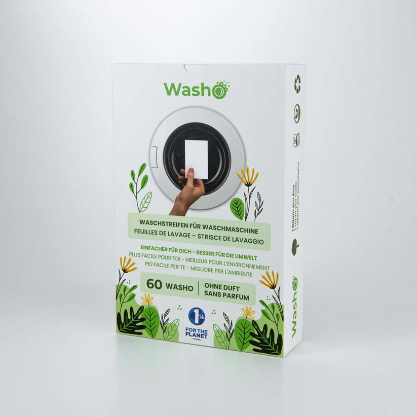 Washo Waschstreifen sind frei von Bleichmitteln, Palmöl, Phosphaten, Farbstoffen und anderen unnötigen Zusätzen.